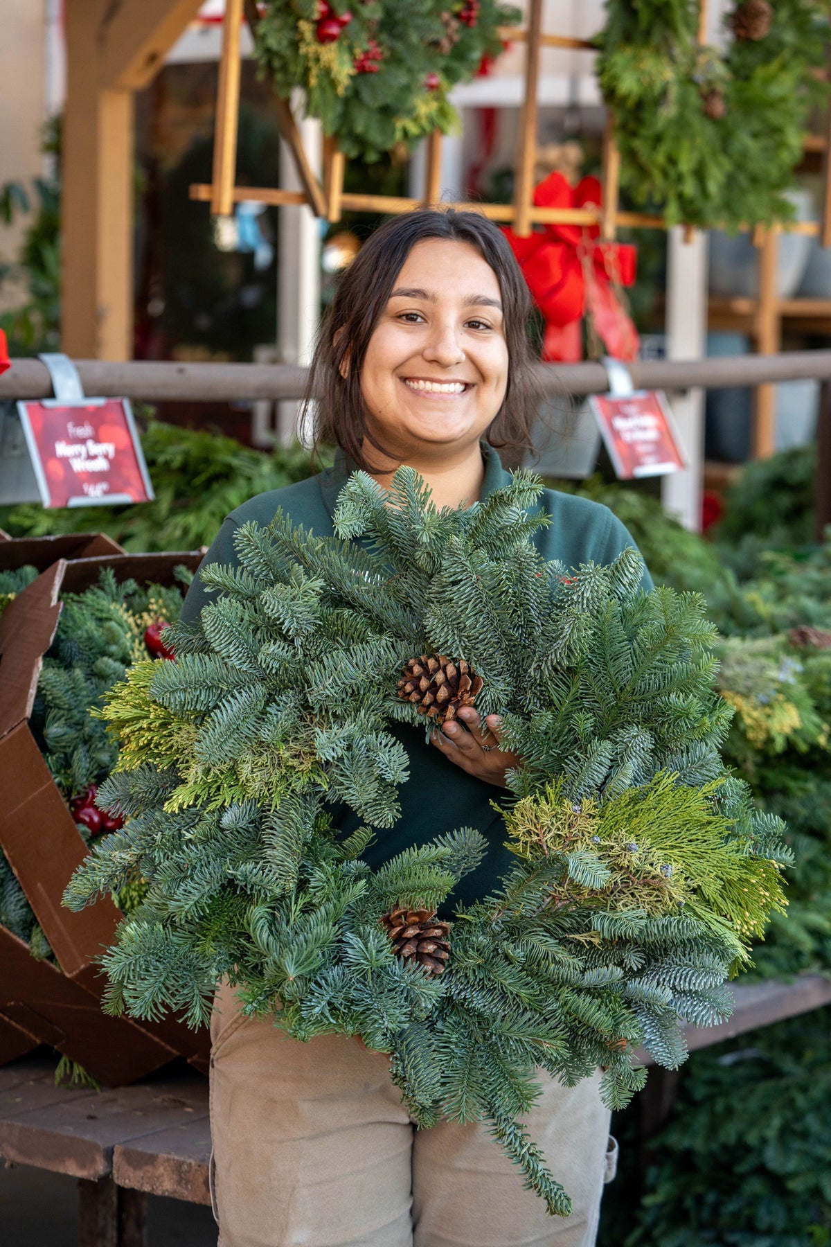 Explore our stunning selection of fresh wreaths—each naturally fragrant and uniquely designed. Decorate with festive touches like bows, holly, and berries, or keep it simple with classic greenery. Available in a variety of sizes to suit any doorway or wall, every wreath is pre-dipped to ensure lasting freshness all season long.