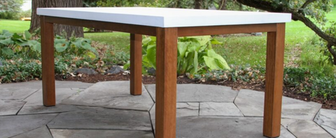 The outdoor dining table features a combination of solid eucalyptus wood and an ivory-colored composite stone top, creating a modern look with mixed materials. The rectangular design comfortably seats six people, making it perfect for hosting al fresco dinner parties or casual weekend brunches. With a water- and UV-resistant finish, this table can withstand various weather conditions, and the built-in umbrella hole provides shade on sunny days.