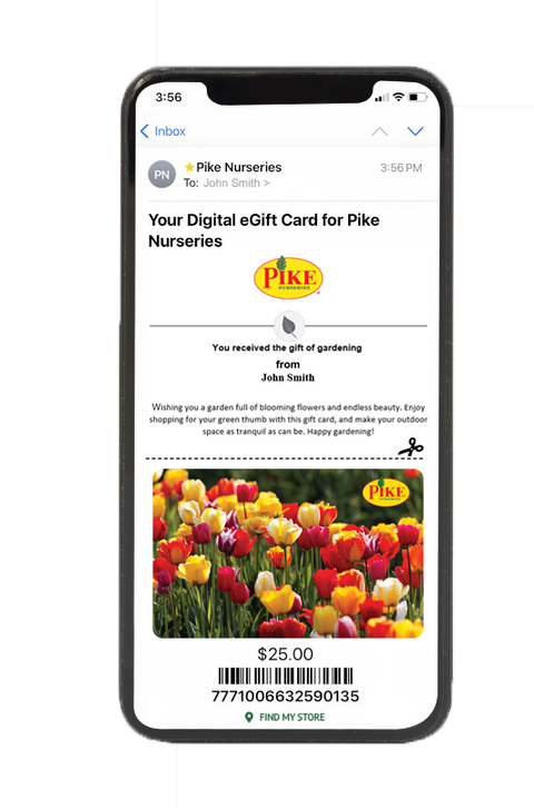 Pike Nursery gift cards never expire. You can feel confident you're giving a gift with value. Redeemable in-store.