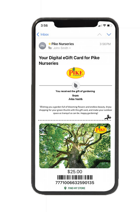 Pike Nursery gift cards never expire. You can feel confident you're giving a gift with value. Redeemable in-store.